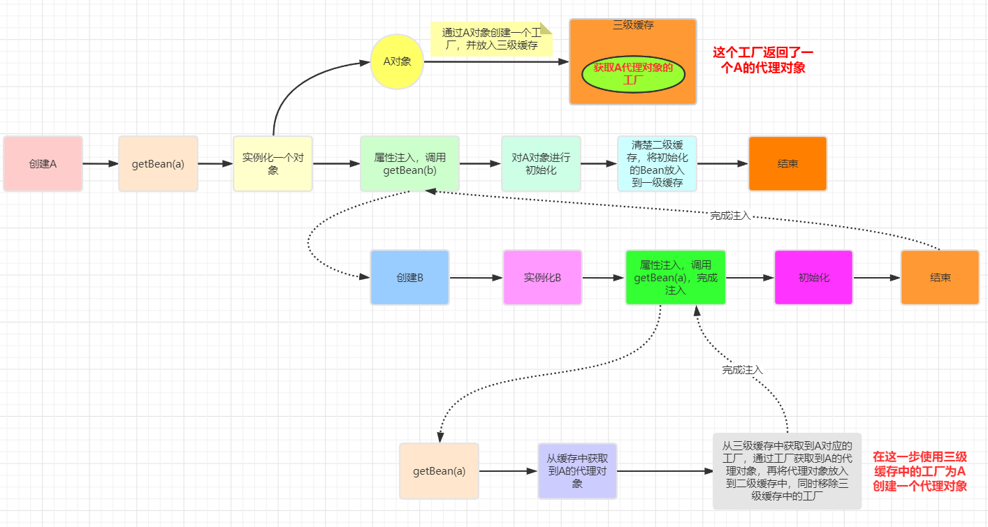 ObjectFactory放入三级缓存。 - 填充 B 的属性: 发现需要 A。